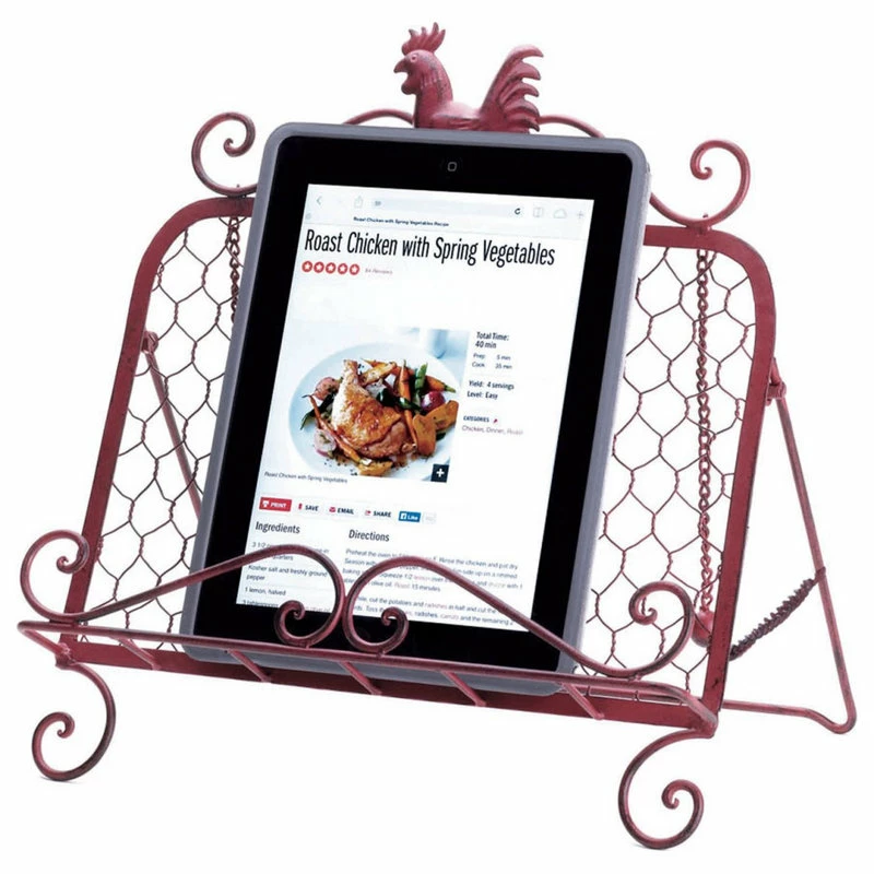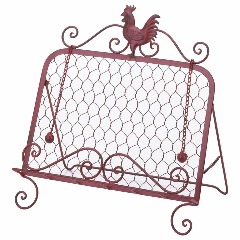 RED ROOSTER COOKBOOK STANDThis handy helper will keep your recipe book just where you need it as you put together a scrumptious meal. The decorative metal framework is highlighted by the country rooster at top and features two page keeper chains. It’s also a great perch for your tablet.