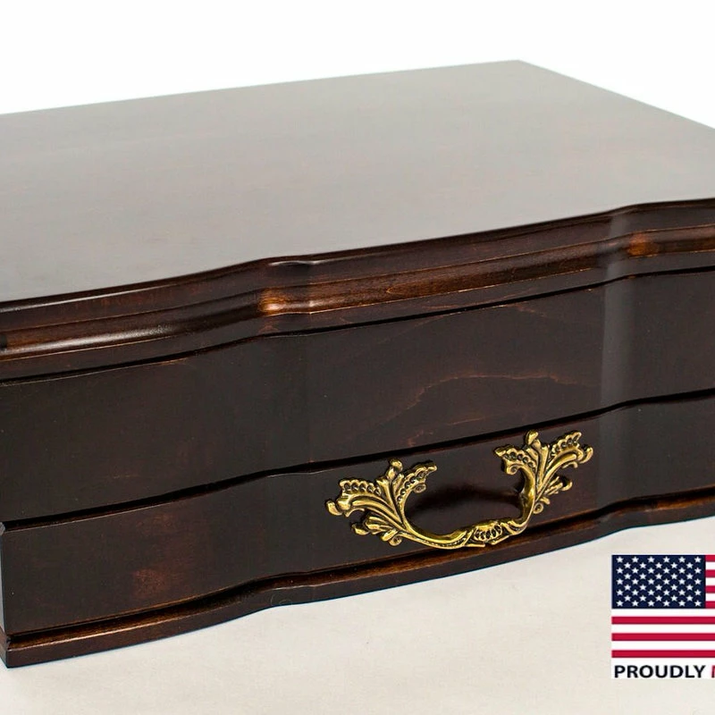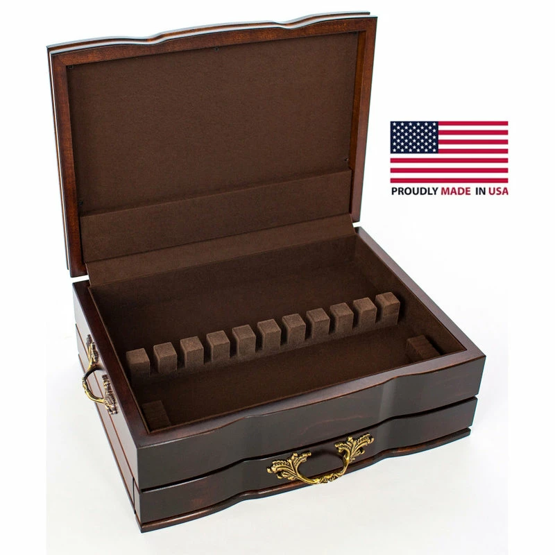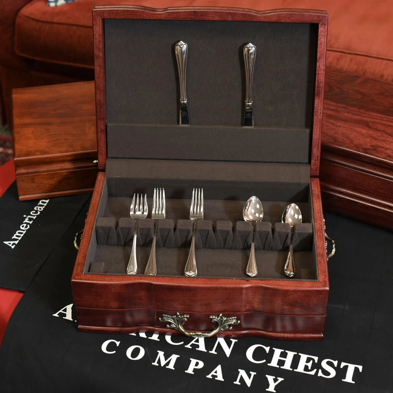 Grandeur Flatware Chest, Solid American Cherry Hardwood with Rich Mahogany Finish & Anti-Tarnish Lining. Antiqued brass finished sculptured hardware.. Holds up to 180 pieces. Service for 24, including 24 knives, 24 dinner forks, 12 salad forks, 12 table spoons, 12 tea spoons and 12 butter spreaders.