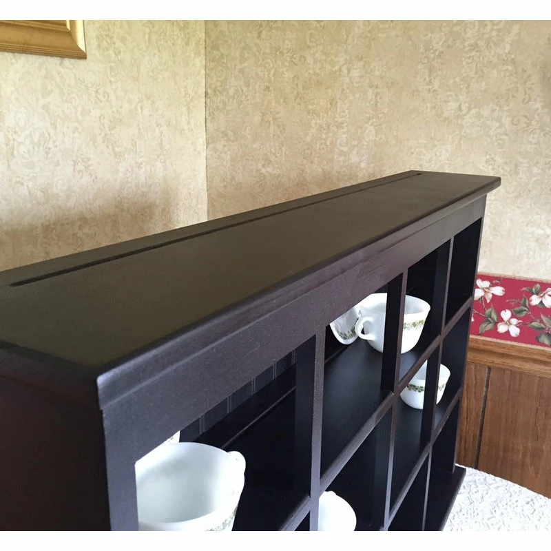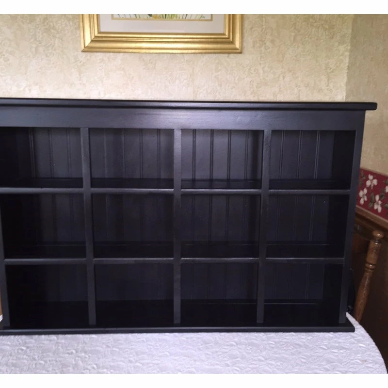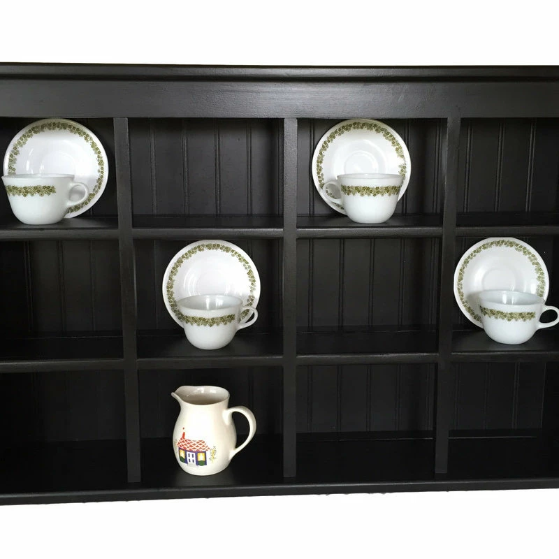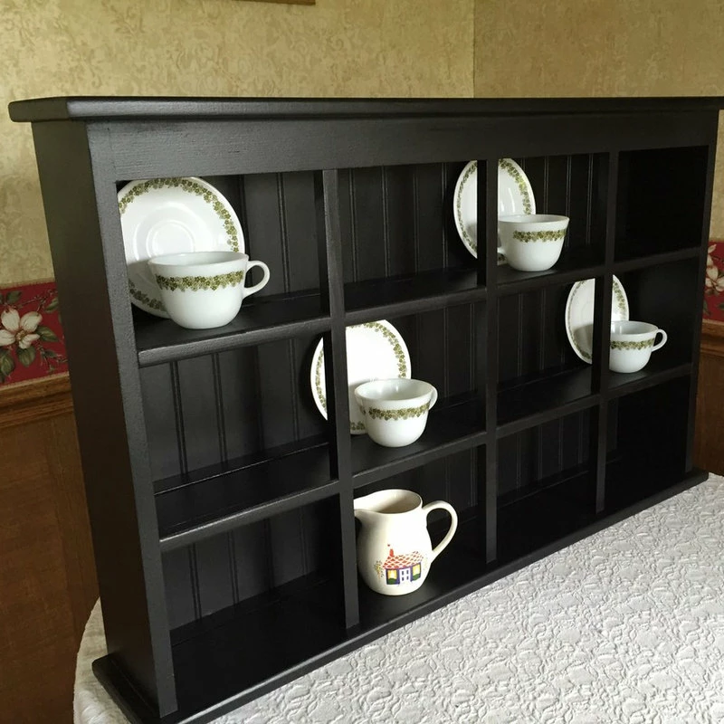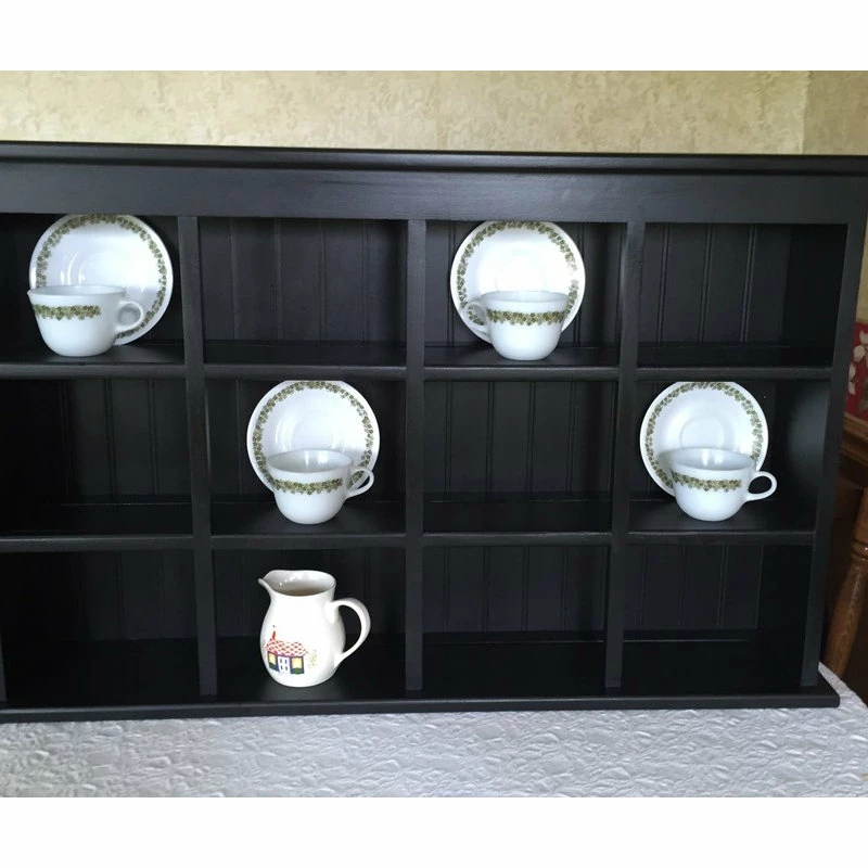 This is a great addition to your Kitchen or Dining Room. It is perfect for display collectable tea cups and saucers. It could be used to display many other things also. It measures an overall 38.5″ wide x 24.5″ tall and 5.75″ deep. Has a total of 12 openings with a plate groove on each shelf. Each square measures 8.31″ wide x 6.5″ tall x 4.25″ deep. The item pictured is shown in black.