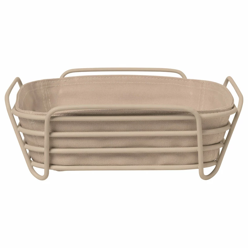 The blomus DELARA wire serving basket large is both decorative and functional. The serving basket is made with a powder coated steel wire frame and features a removable cotton liner. The fabric insert can be easily removed for washing. The basket is perfect for serving bread, chips or crackers or for general storage. Available colors: Magnet (charcoal), Sharkskin (grey), Nomad (tan), Moonbeam (cream).