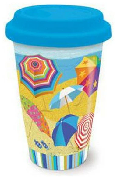 The pretty coastal colors and beach umbrella design of this travel mug make it a truly wonderful gift- whether it’s a gift to yourself or a friend!. Coastal Beach Umbrellas on Parade Coffee Latte Tea Cerarmic Travel Mug with Lid. Measures approximately 5 1/4 inches x 3 1/2 inches x 3 1/2 inches; lid measures 3 3/4 inches x 3 3/4 inches x 3/4 inches. 10 ounce capacity, Double walled insulation, keeps drinks hot or cold longer. Artwork wraps completely around mug, made of ceramic with rubber lid, imported. Microwave safe, Dishwasher safe with removal of plug in base