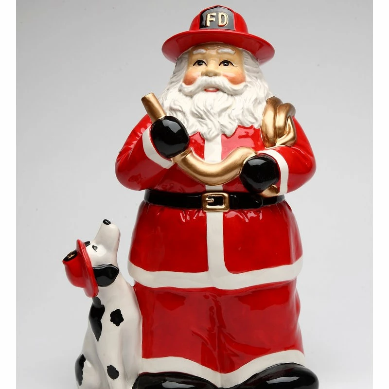 The Firefighter Santa Cookie Jar makes a fun, festive addition to a home during the holiday season. Made from hand-painted ceramic, this Santa jar is eye-catching and unique. Display it on a kitchen island or side table. Hand wash only.