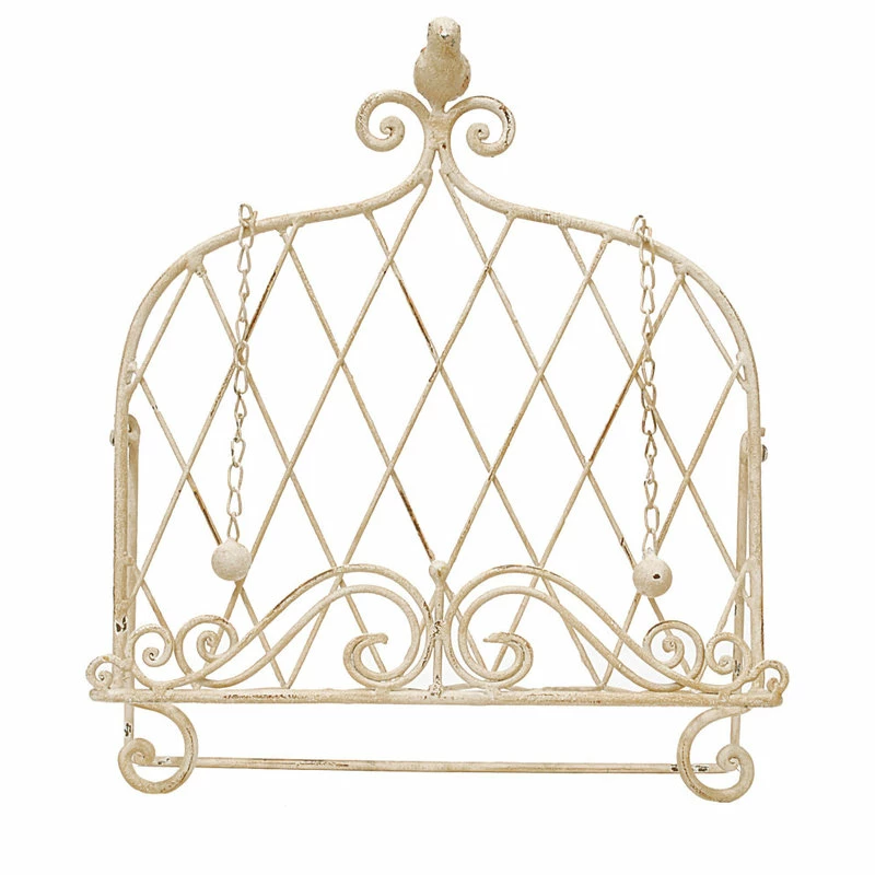 This cookbook holder is so exquisite that it should be kept out as a decorative piece even when not in use. The elaborate scrollwork with cream finish is enhanced by the weighted chains to hold a book open. It could also be used to display an antique book or other special book of your choosing.
