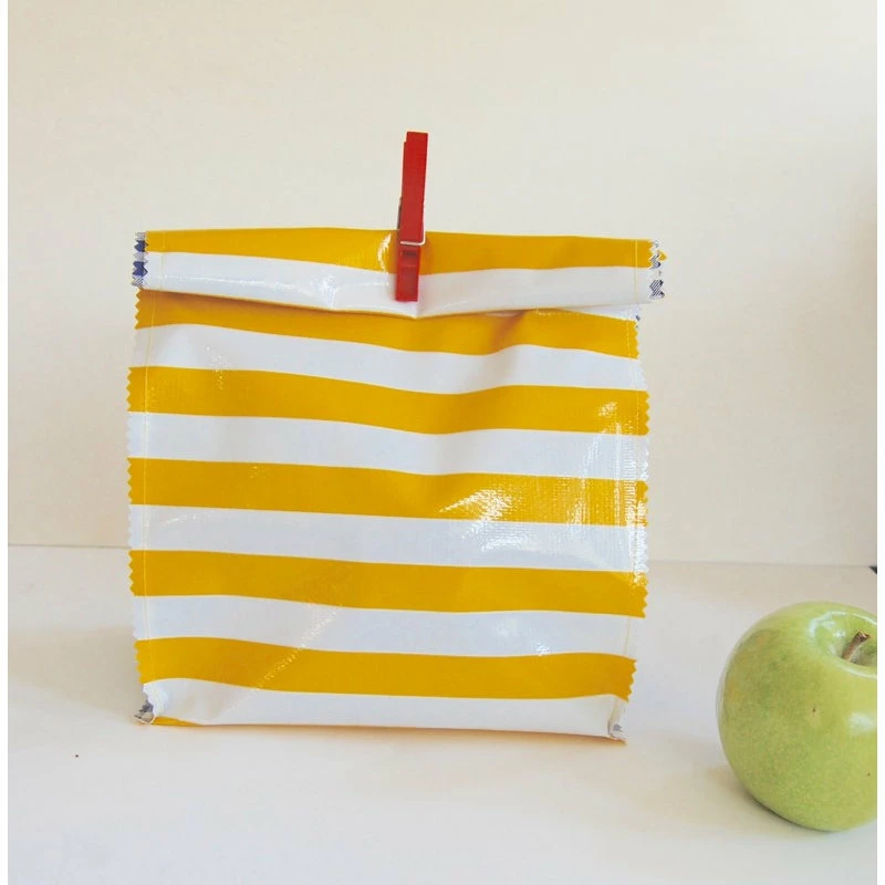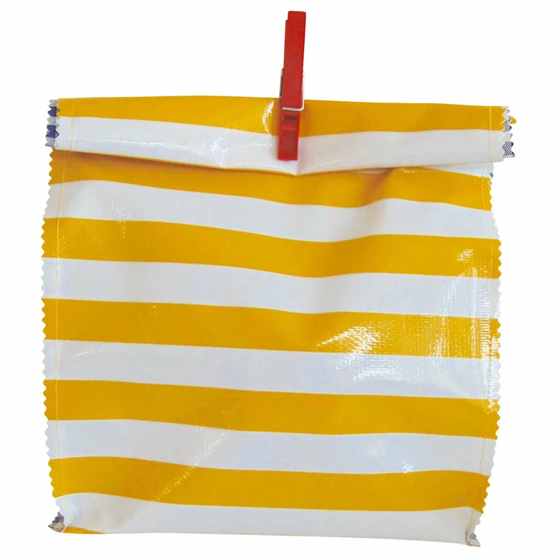 Your lunch bag doesn’t have to be boring, we’ve got a wide variety of a colorful ones to help out. This cute little lunch bag is made of yellow striped oil cloth with blue gingham side panels. This lunch bag is wipeable and reusable too which makes life that much easier. Comes with a red clothes pin to close.