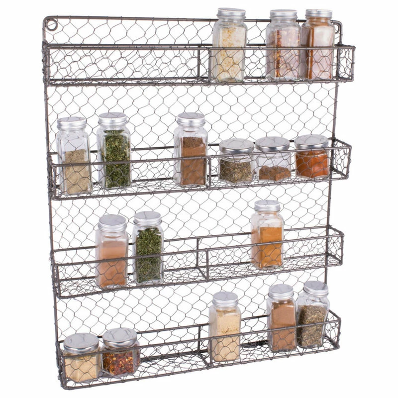 Crafted of antiqued finish “chicken coop” metal wire with a sturdy frame and vintage look, add country appeal to your kitchen with these charming spice racks. This 4 tier wire rack is perfect for wall mounting, cabinet, or pantry storage. Suitable for all your small organizing needs in the kitchen – from spices to oils, shot glasses, foods and jars. Or for your beauty needs, hang in the salon or bathroom to display or store your favorite nail polish, lotion, or essential oils!