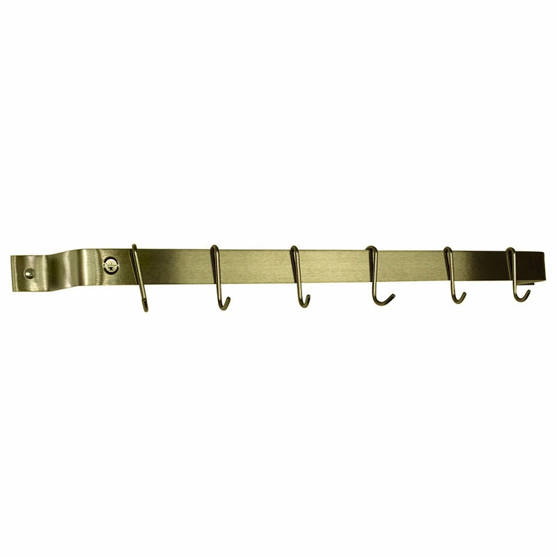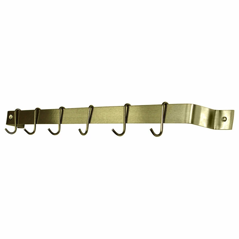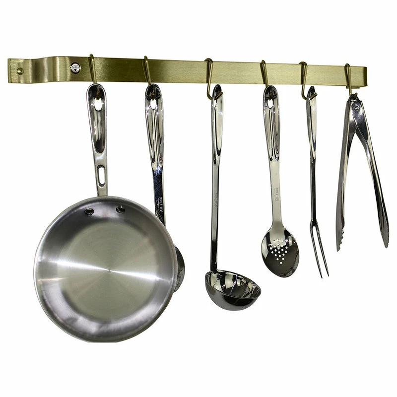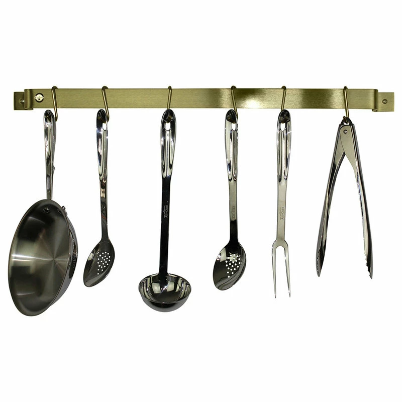 Handcrafted in the USA, this Solid Steel Easy Mount 30″ Wall Rack Utensil Bar will help get your cookware, utensils, pots, pans, mugs, towels or tools out of the drawer and up on the wall where you can organize and access them easily. A great solution for small spaces, urban living, and even your BBQ area. Each piece is forged from Solid Carbon Steel using traditional French metal working techniques. The Brass Finish is powder coated for lasting beauty. Includes 6 Straight Multi-Purpose Hooks. Hardware and instructions for recommended installation are included. Mounting directly into studs is recommended. Consult your handyman or local hardware store for mounting to your specific wall type. For custom sizes or if you have any questions, contact Enclume Design Products directly.Includes 6 Straight Multi-Purpose Pot Hooks.Solid Carbon Steel Frame and Hooks.Forged by our Skilled Craftsmen in the Pacific Northwest, USA.No Assembly Required. Hardware and Installation Instructions Included.Mount Directly into Studs or in Drywall.