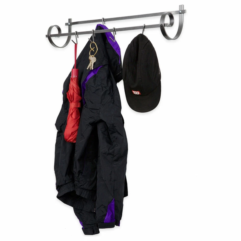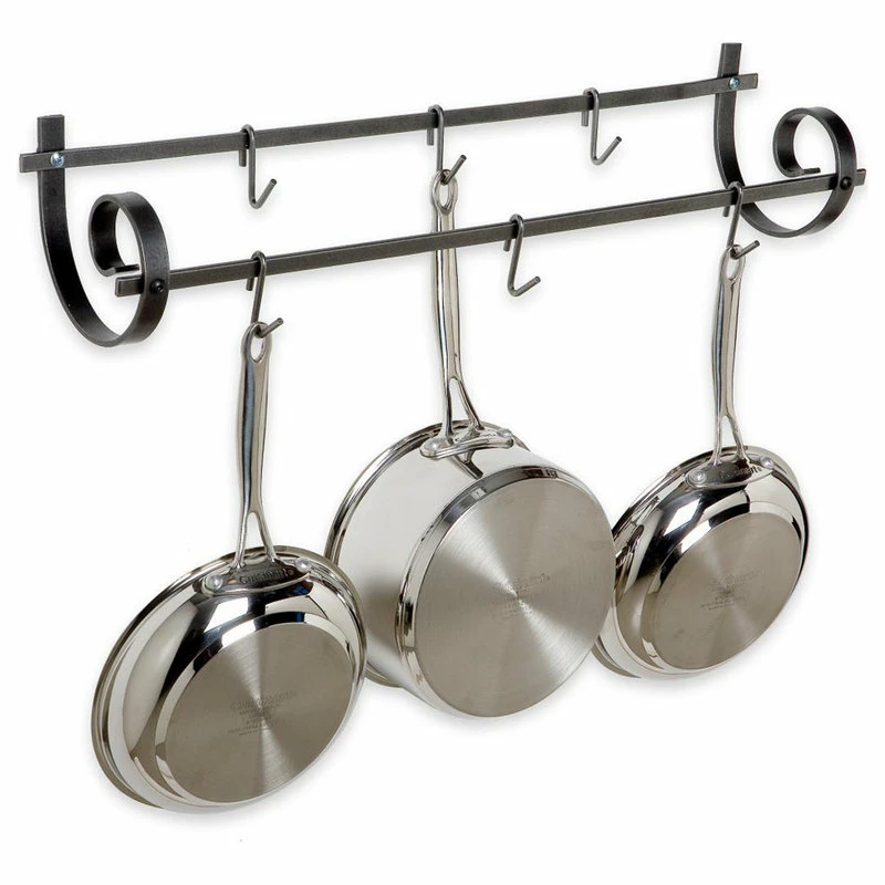 The compact Decor Utensil Rack adds flair to the common wall mounted pot rack. Hang your cookware, utensils, towels and anything else you can imagine! The scrolled ends resulted from fine craftsmanship meeting a decorative need in your home. Comes with 6 pothooks. The Decor Collection is a lighter-weight stock than our premier line, yet constructed of superior hot rolled, high carbon, steel, and presented in Enclume’s Signature “Hammered Steel” finish with a protective acrylic coating to deliver our expected beauty, durability, and strength for lasting value and enjoyment. Fast, simple installation, with Enclume’s exclusive “Toggler” anchors. Install toggler instantly in standard drywall. Holds hundreds of pounds. All hardware necessary for installation is included. Comes assembled. 5 Year Limited Warranty. Hand wrought by skilled craftsmen and proudly made in the USA.