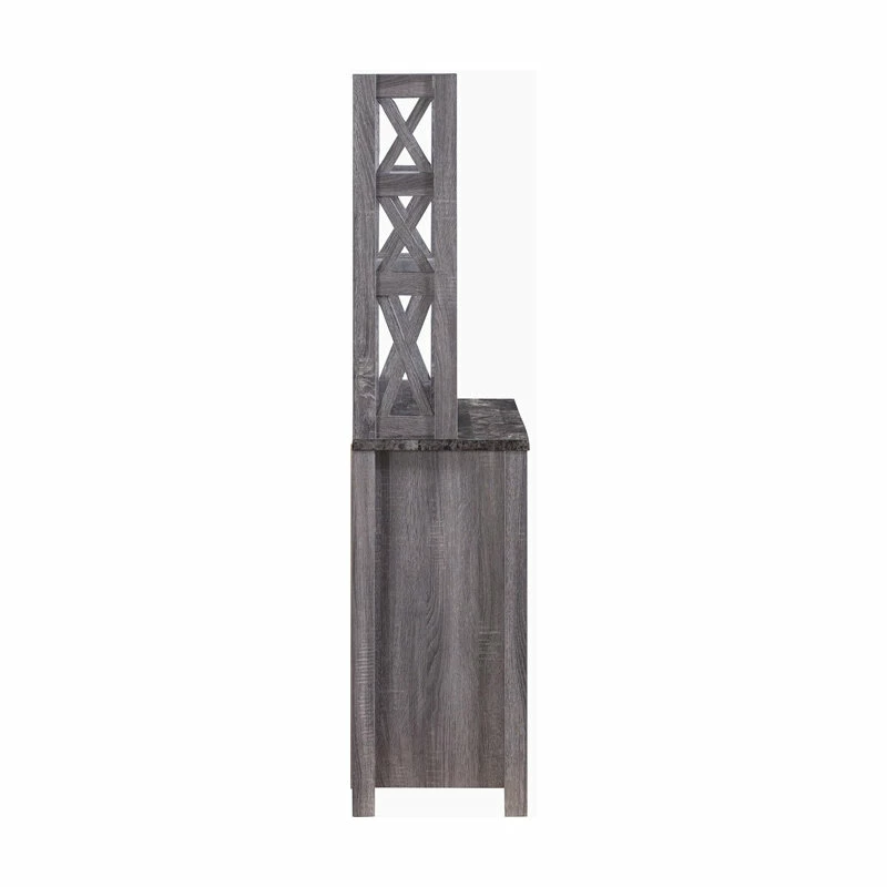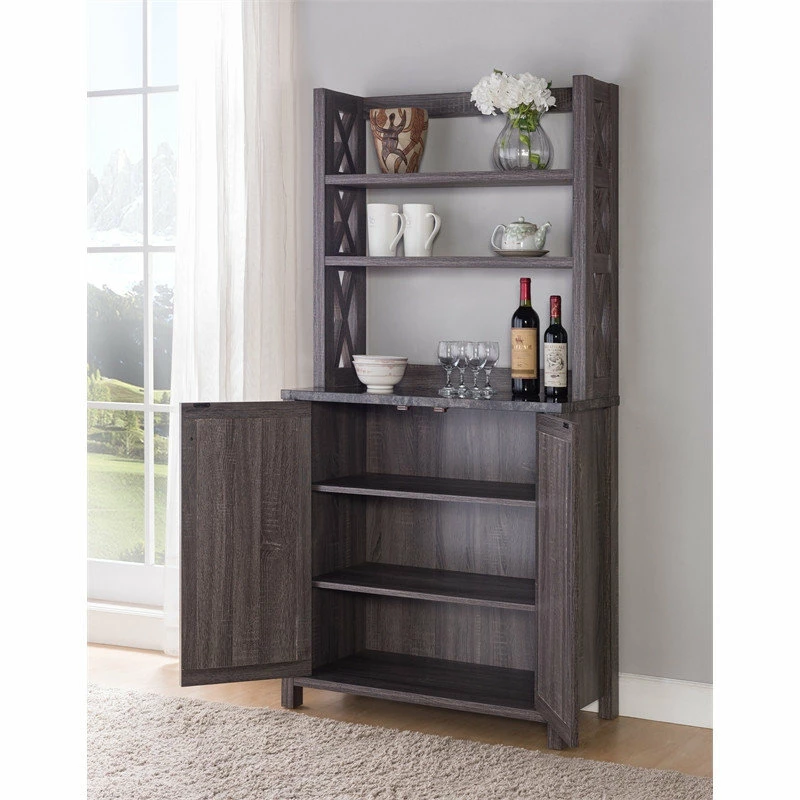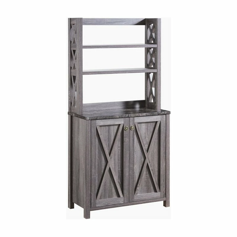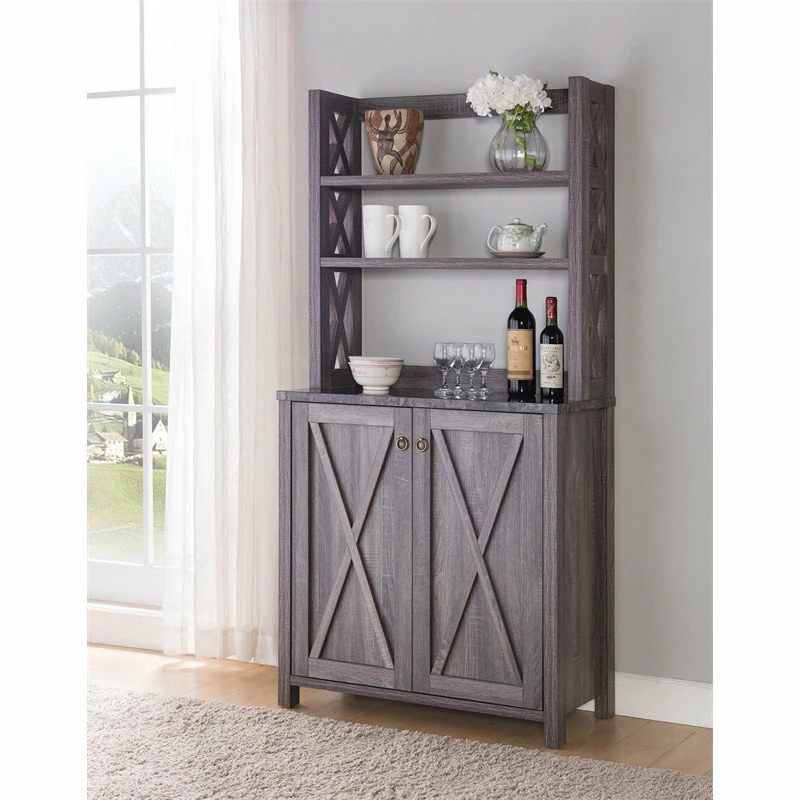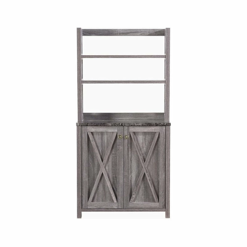 With an appealing design that’s both subtle and striking, this farmhouse style wood kitchen cabinet blends simple lines and bold X shapes to create a classic aesthetic with a modern twist. Crafted with three open shelves atop a generous two-door cabinet, it provides plenty of space for dishware, serving utensils, packaged foods, and more. The neutral distressed gray finish further lends to the rustic, country vibe.