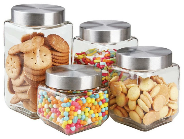 Four piece square glass canister clears up counter tops by providing neat storage space for dry ingredients. It’s elegant clear glass design and metal tops keeps dry food fresh longer.