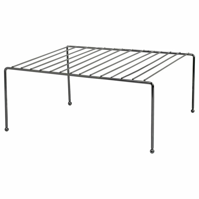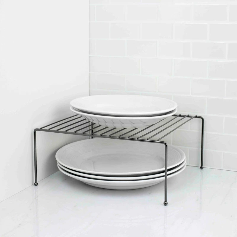 - Store and organize plates, mugs, bowls, and other kitchen essentials on this helper shelf. Made from a black onyx steel finish. Increace your storage space by placing the shelf on the counter top or in a cabinet. Small profile keeps it out of the way but still holds a good amount of kitchen items. Looks great in any kitchen setting.