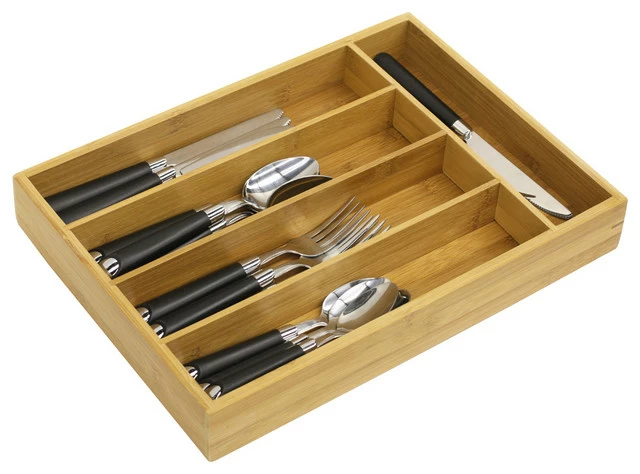 Brighten up your kitchen drawers with this nature inspired bamboo cutlery organizer. Made from all natural bamboo with a natural finish it features 5 spacious compartments to neatly organize everything from cooking utensils, silverware, and jewelry. Lightweight yet very sturdy, it fits great in most cabinets and drawers.