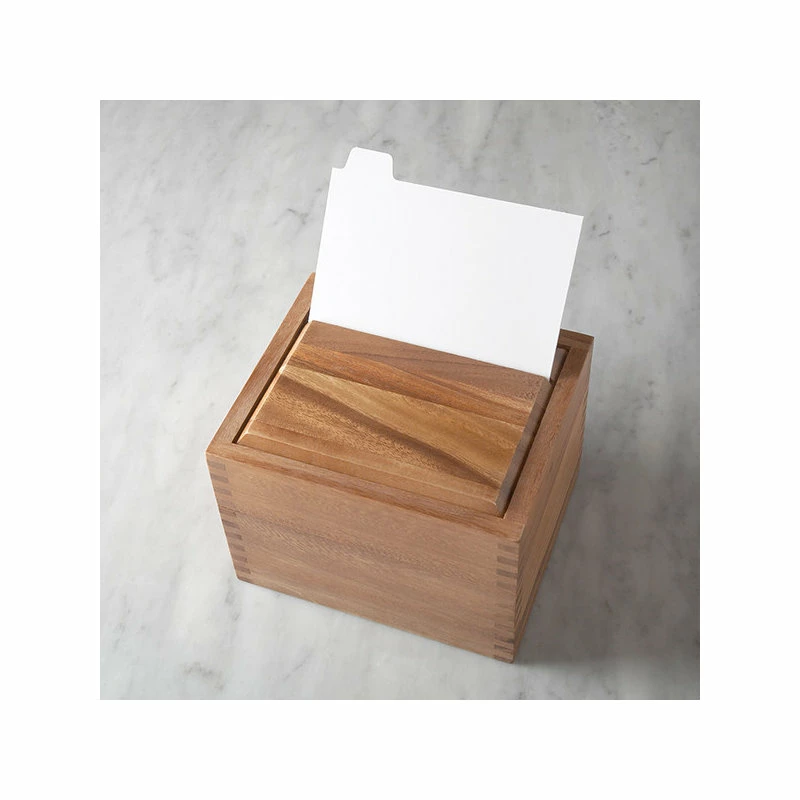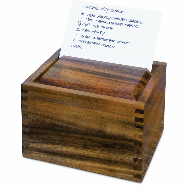 Keep your favorite recipes organized with the stunning Acacia Wood Recipe Box. Perfect for six-inch by four-inch recipe cards, the Acacia Wood Recipe Box features a slotted top that can hold a recipe card for convenient access while cooking.
