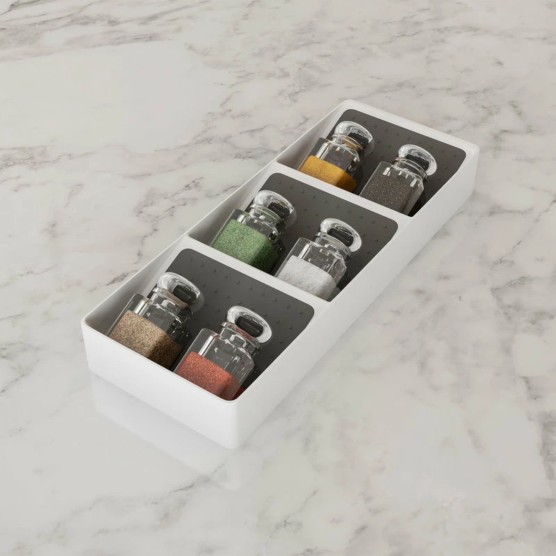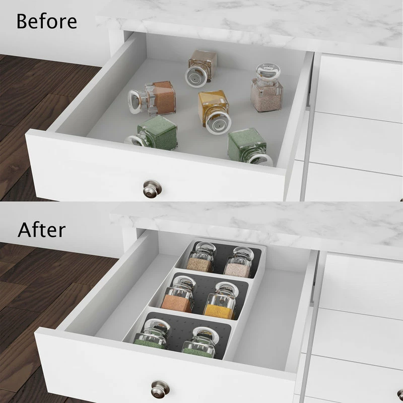 SPACE SAVING- This three-tiered organizer shelf features a narrow design. This allows you to maximize storage in small drawers in your pantry, kitchen, bathroom, garage or home office.