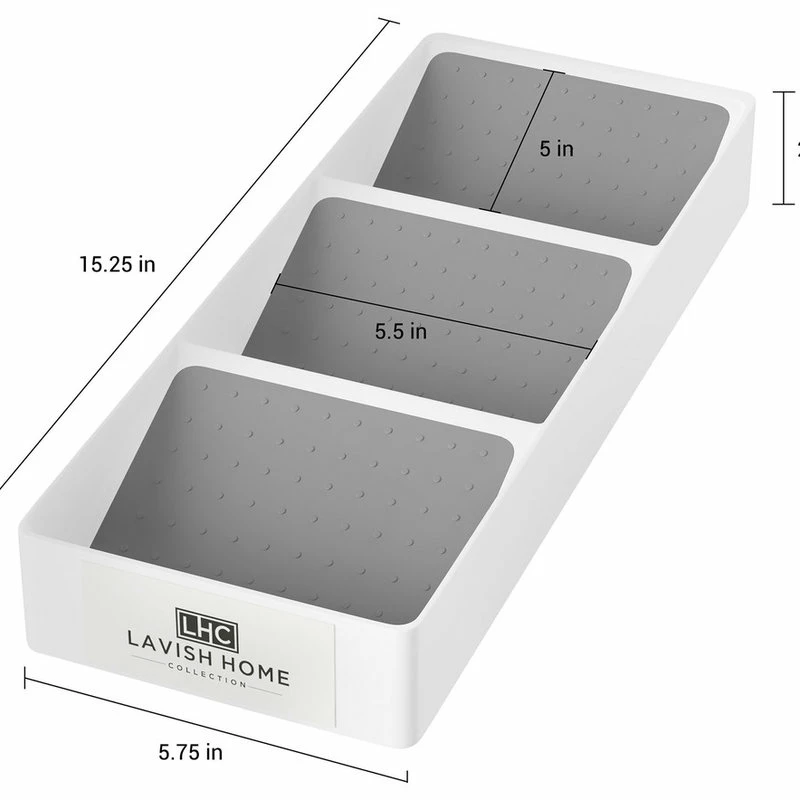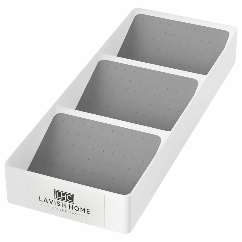 Keep your home neat and organized with the 3-Tiered Nonslip Drawer Organizer by Lavish Home. This 3-tiered shelf has an angled tray design that easily fits into drawers, freeing up space in small areas and allows you to take inventory at a glance. The organizer is made of polypropylene plastic and features a non-slip rubber liner to keep jars, bottles and other items safely in place. This organizer features a single-piece construction, meaning there is no assembly required and its ready to use straight out of the box! This shelf is also great for use in your office, bathroom or laundry room to keep your home clutter free.