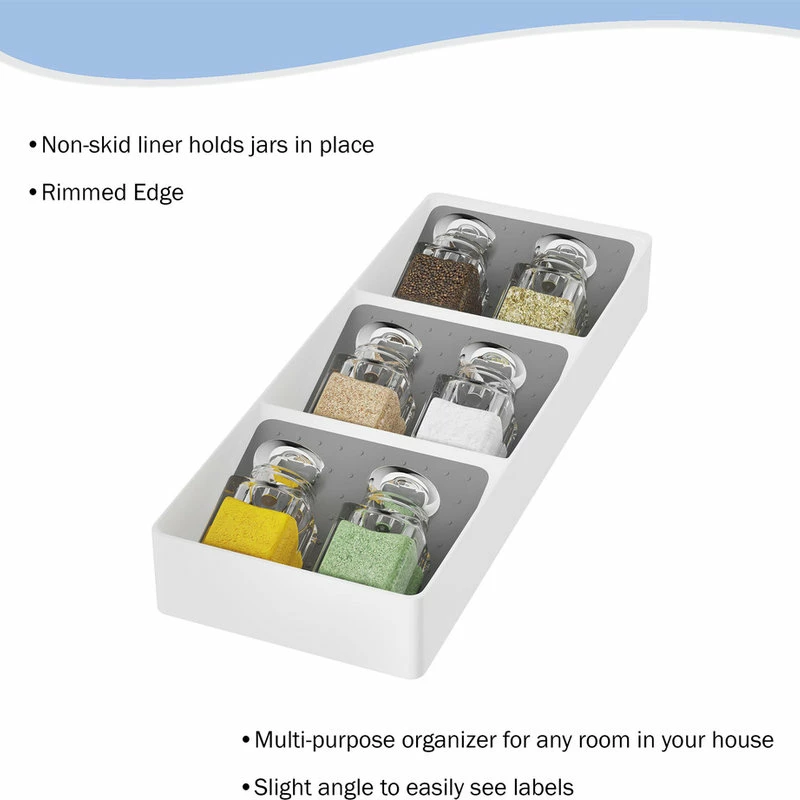 NON-SKID LINER- This organizer features a non-slip, thermoplastic rubber line on each shelf. This helps to keep spices, health and beauty products or office supplies securely in place while working around it or opening drawers.