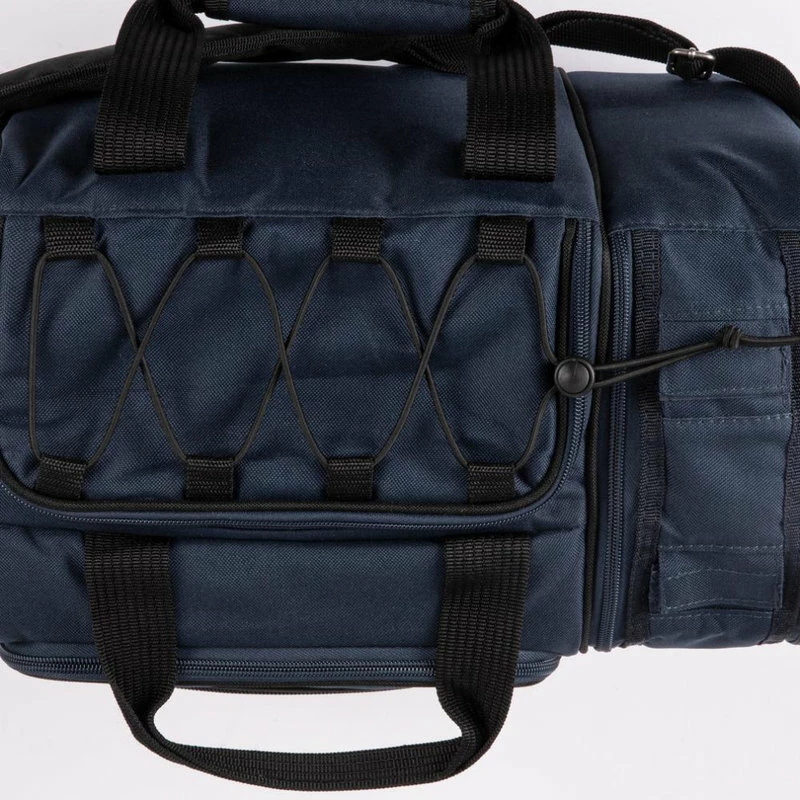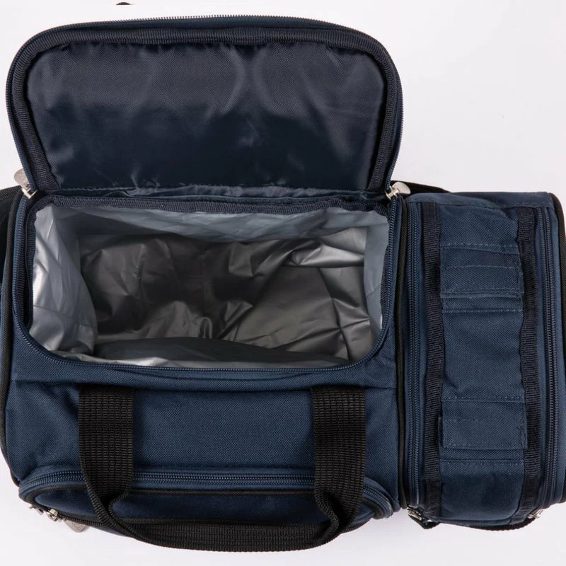 - Separate, insulated, two-bottle beverage section with padded divider and peek-through closures for tall bottles