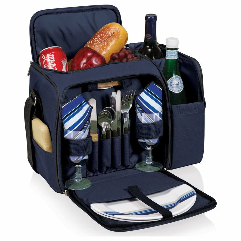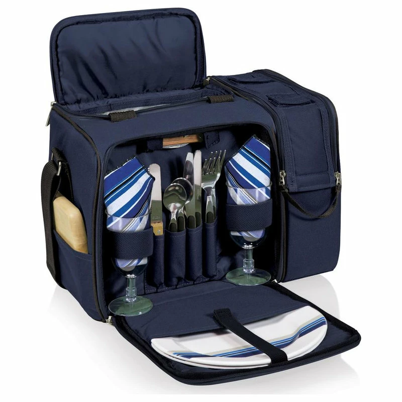 Includes: 1 Picnic tote2 Plates (melamine, 9″, Nouveau Grapes design)2 Wine glasses (PS, 8 oz.)4 Napkins (100% cotton, 14″ x 14″, Nouveau Grapes design)2 (18/0) Stainless steel forks