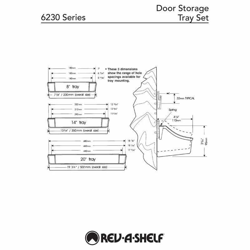 Expand cabinet space with Rev-A-Shelf’s handy two tray door storage set. The 6230 Series is available in three different sizes. Easy to install with screw-in clips or mount the trays to 24″ or 58″ aluminum standards with tray clips (sold separately).