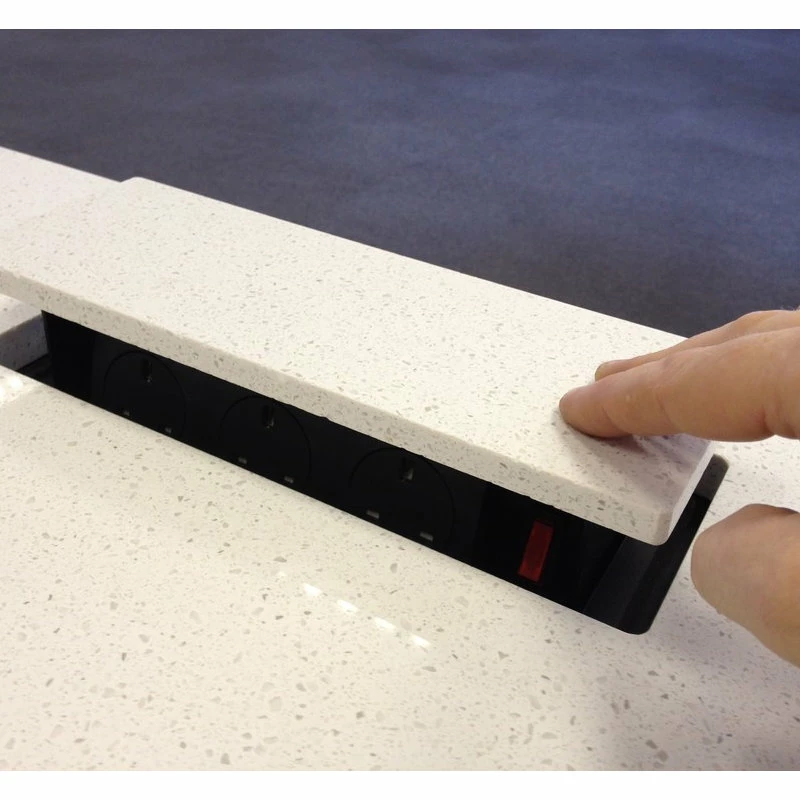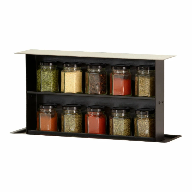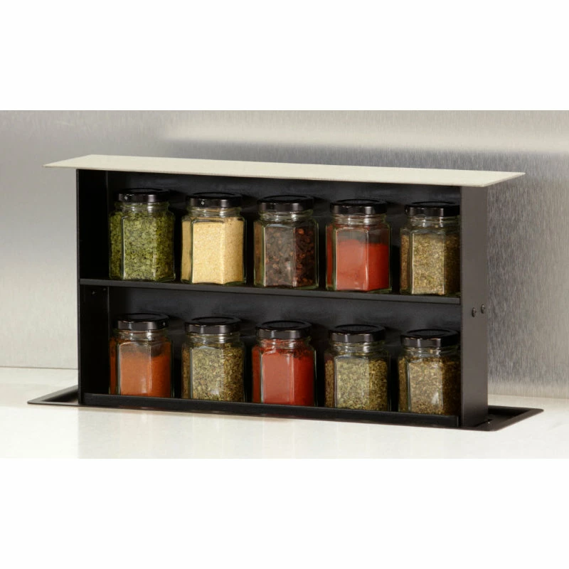 SBOX pop-up storage works on a patented counterbalance system. A simple press and release activates the mechanism and up pops your SBOX. The system allows you to store everyday items into the recesses of your counter when not in use and eliminates the clutter. Simple to install and offers several mounting options including using a matching blank of your countertop to fully conceal the unit. The SBOX includes everything you need to install and features a premium grade stainless steel top and collar. SBOX is the next revolution in kitchen storage. The SBOX SPICE includes 10 glass jars which fit on the two included shelves. Ideal to display and access your primary spices when you needed.