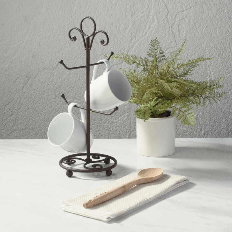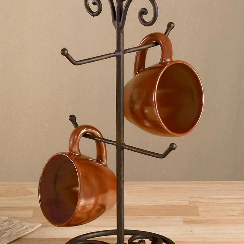 Display your favorite mugs while keeping countertops clutter free with the simple and sturdy 4-Arm Mug Stand. Made of metal with a black painted finish and brown accents, this piece is 17″ tall and accentuates any space! Add a welcoming touch to your kitchen by displaying your favorite mugs on this charming stand. Keep the modern mug tree on your kitchen counter, coffee station or bar cart to keep favorite mugs within easy reach.
