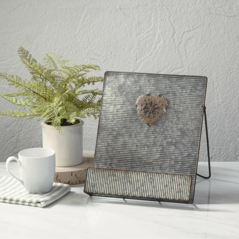 Farmhouse style cookbook stand provides the perfect resting spot for any cookbook while keeping it open to exactly the page you need. Features a textured metal finish and wood handle. Deliberately aged finish style will be sure to embellish any setting.