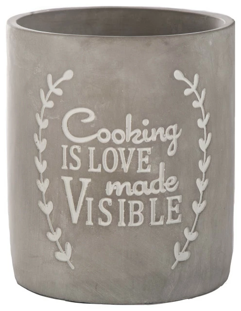 - Cement Round Utensils Holder with Engraved “Cooking is Love Made Visible” Design Shiny Finish Gray