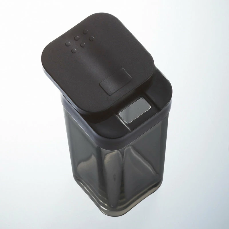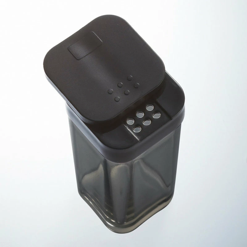 Our spice bottles are designed for ultimate ease of use. The tops are sliding so that you can open bottles with one hand, and they are equipped with spouts for sprinkling or pouring. The streamlined matching rack has a silicone bottom.