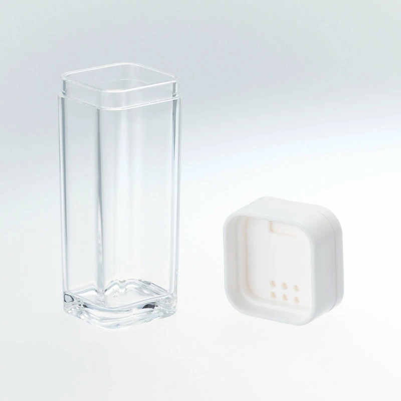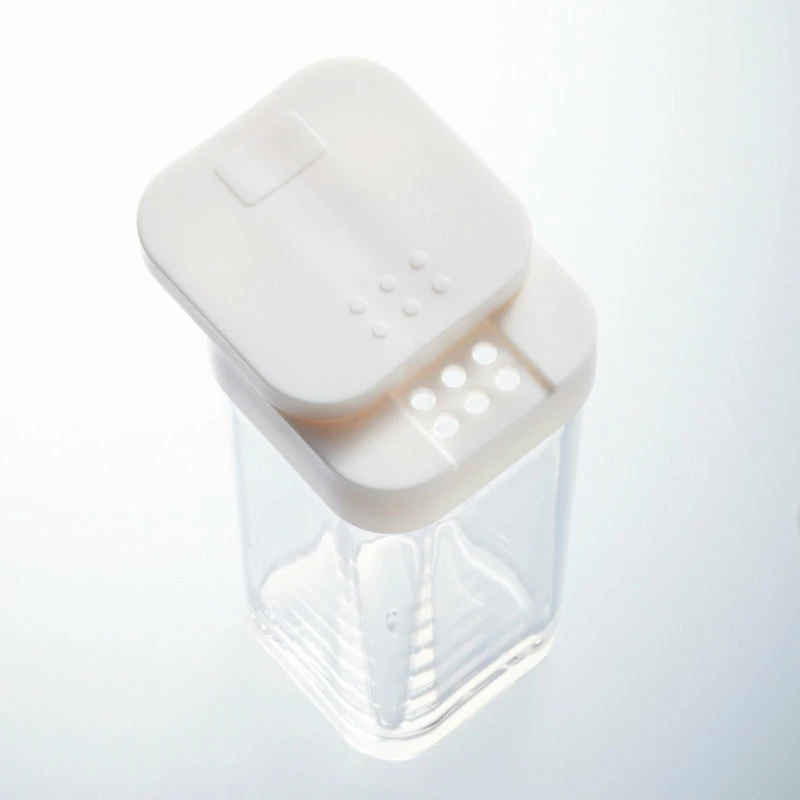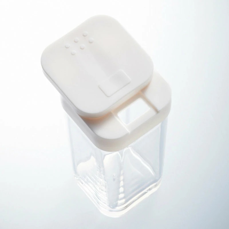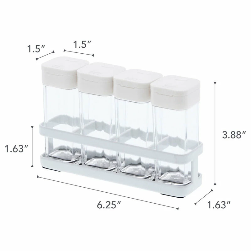 Our spice bottles are designed for ultimate ease of use. The tops are sliding so that you can open bottles with one hand, and they are equipped with spouts for sprinkling or pouring. The streamlined matching rack has a silicone bottom.